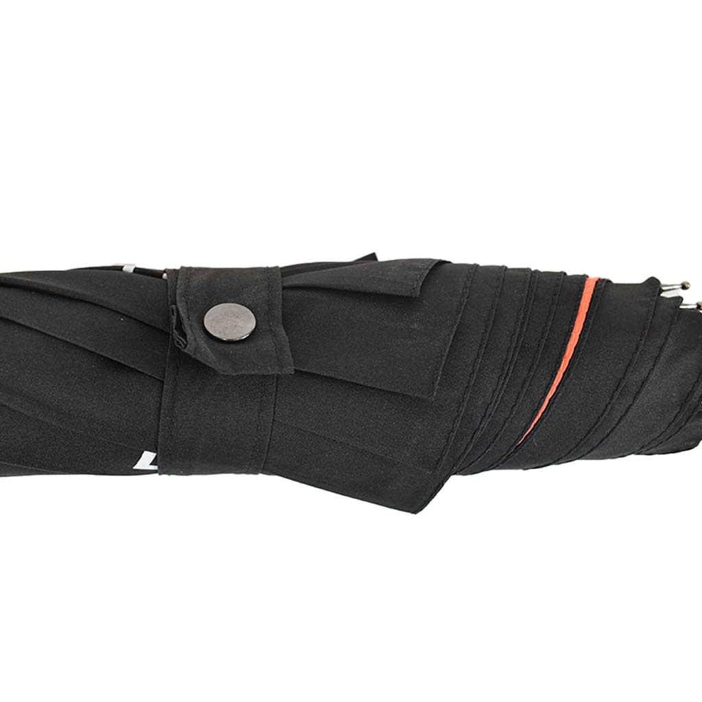 The City Walker Pro, as its name suggests, is ideally suited for urban environments, navigating crowded spaces and busy streets with ease. This Pantone matched umbrella boasts a two-layer canopy, known as a double canopy, allowing the client to provide distinct designs for both the exterior and interior. The outer canopy is black with white logos printed on two panels, while the inner canopy is Pantone matched to the client’s brand colour guidelines, featuring a digitally printed dotted pattern across the panels.