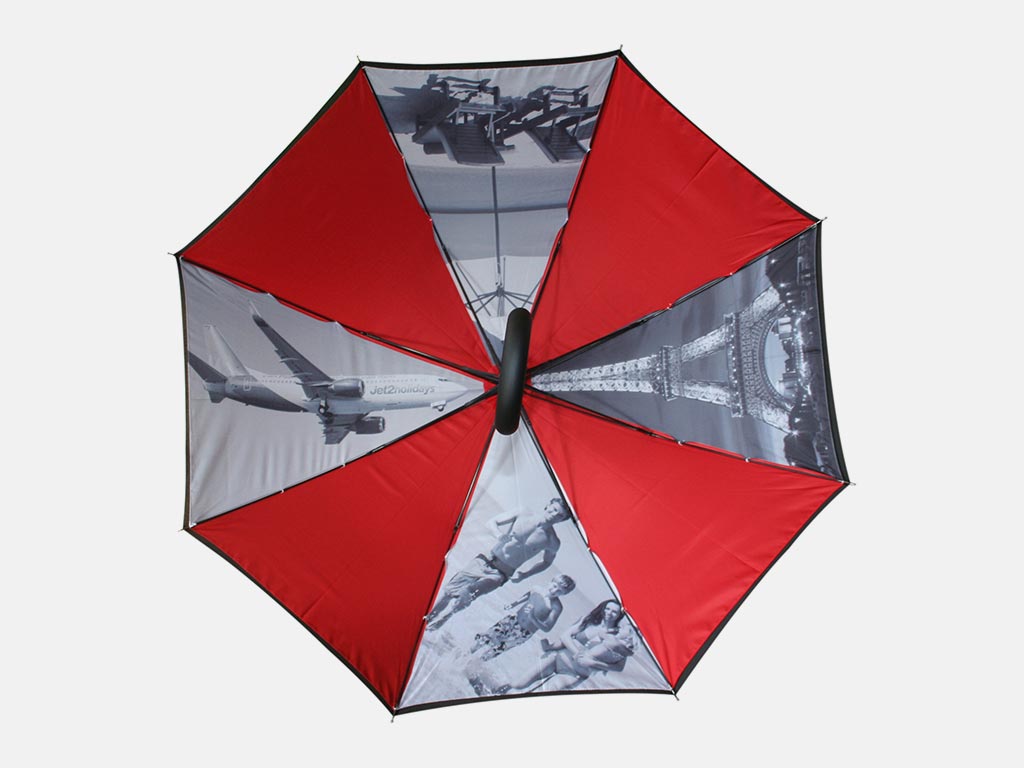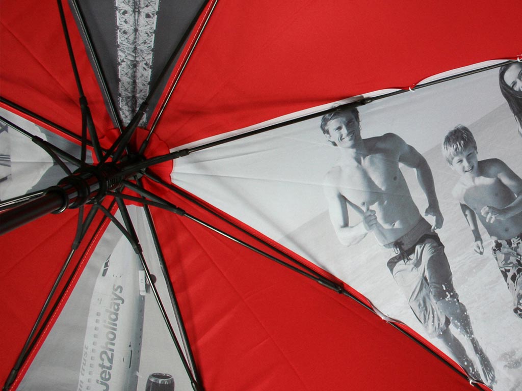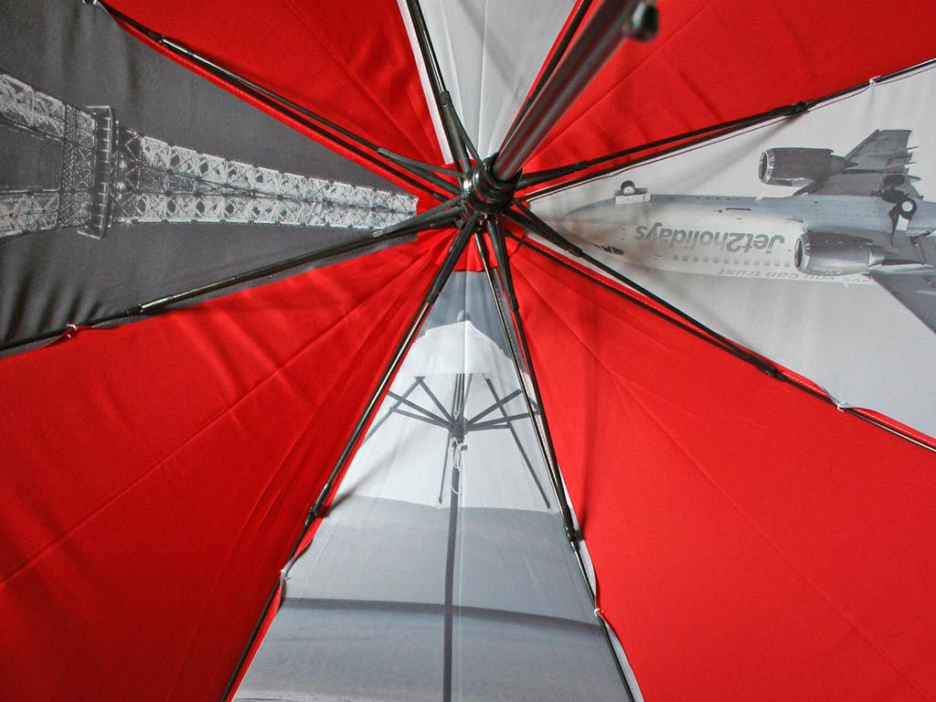 Our finished product was a double canopy City Walker umbrella good enough to find its way onto a billionaire’s yacht. With a classic black exterior, the interior intersperses bold red Pantone matched panels with attractive black and white photographic imagery.