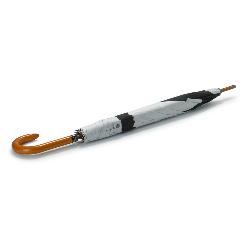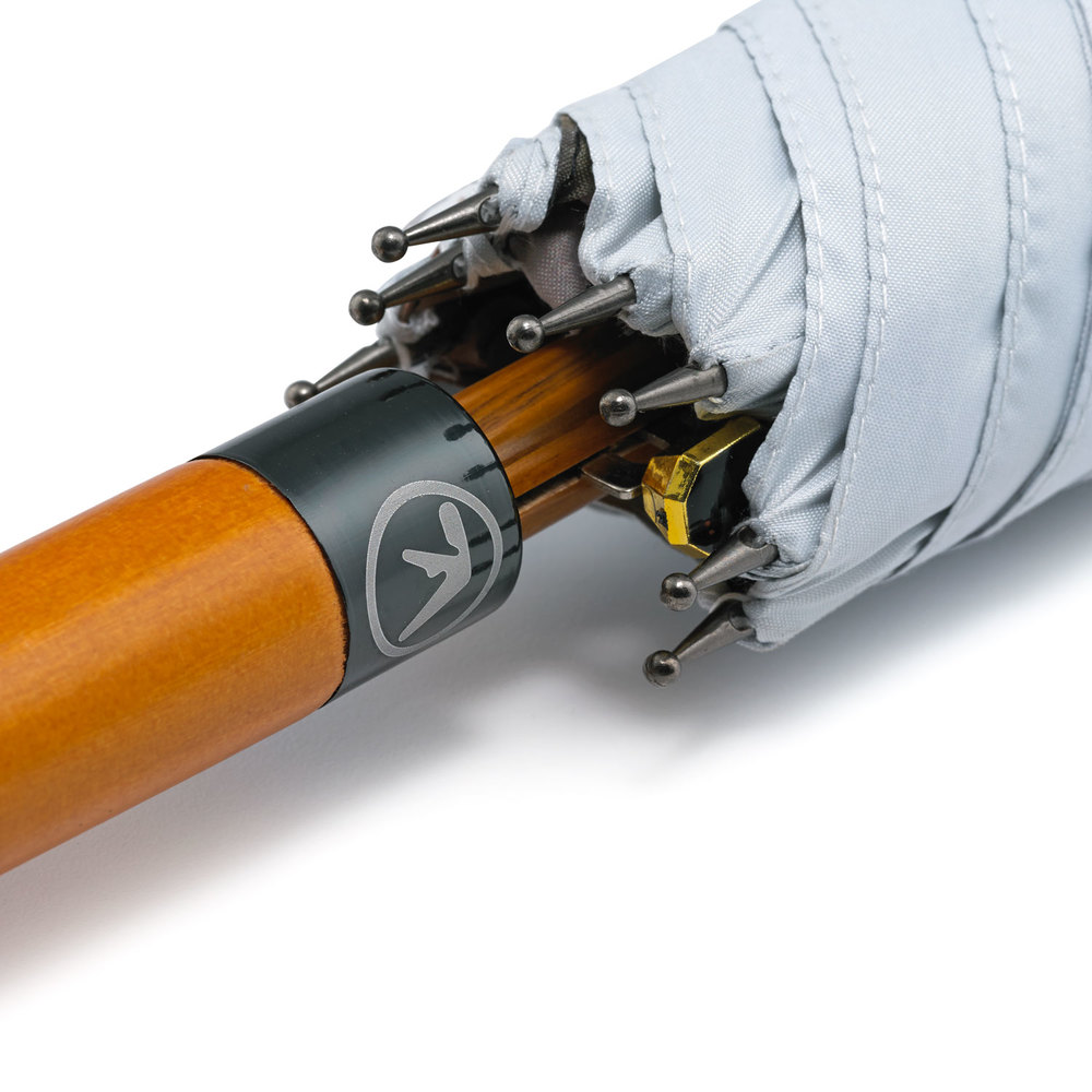 - Engraved Handle Ring: The branding is further enhanced by an engraved metal handle ring, featuring the same logo that appears on the printed panels. This detail adds a sophisticated and personalised element to the umbrella.
