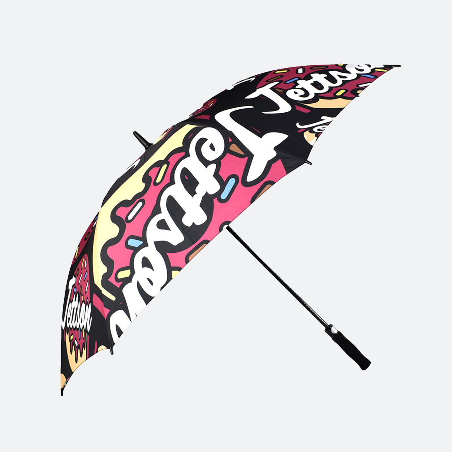 The result was an exquisite automatic wood walker umbrella featuring a sophisticated black exterior contrasted with a vibrant umbrella printed rainbow on inside, with each inner panel showcasing different colours on inside of umbrella. This premium product immediately became a flagship item, reinforcing the artist’s brand identity, and setting a new standard for creative artist merchandise.