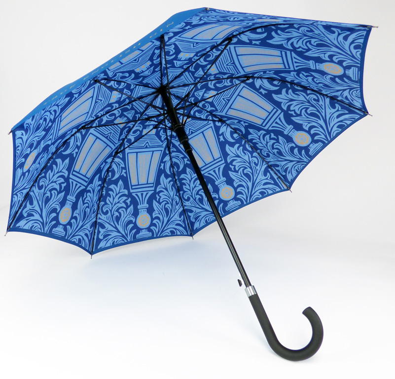 This blue graphic design umbrella was customised for a well known English gin company. We used a double canopy City Walker Umbrella with the design individually printed on each panel of the internal canopy. A bright royal blue top canopy with their company’s slogan complimented the fun graphic print.