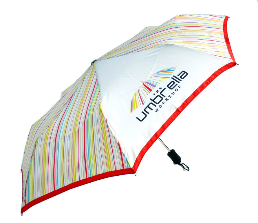 Made to order umbrellas are customised in multiple ways. From printing inside and outside of the umbrella panels and matching the seams during construction for continuous prints, to the branded tie wrap which can be embroidered or printed. The umbrella carry sleeve can be personalised with print or with a strap.