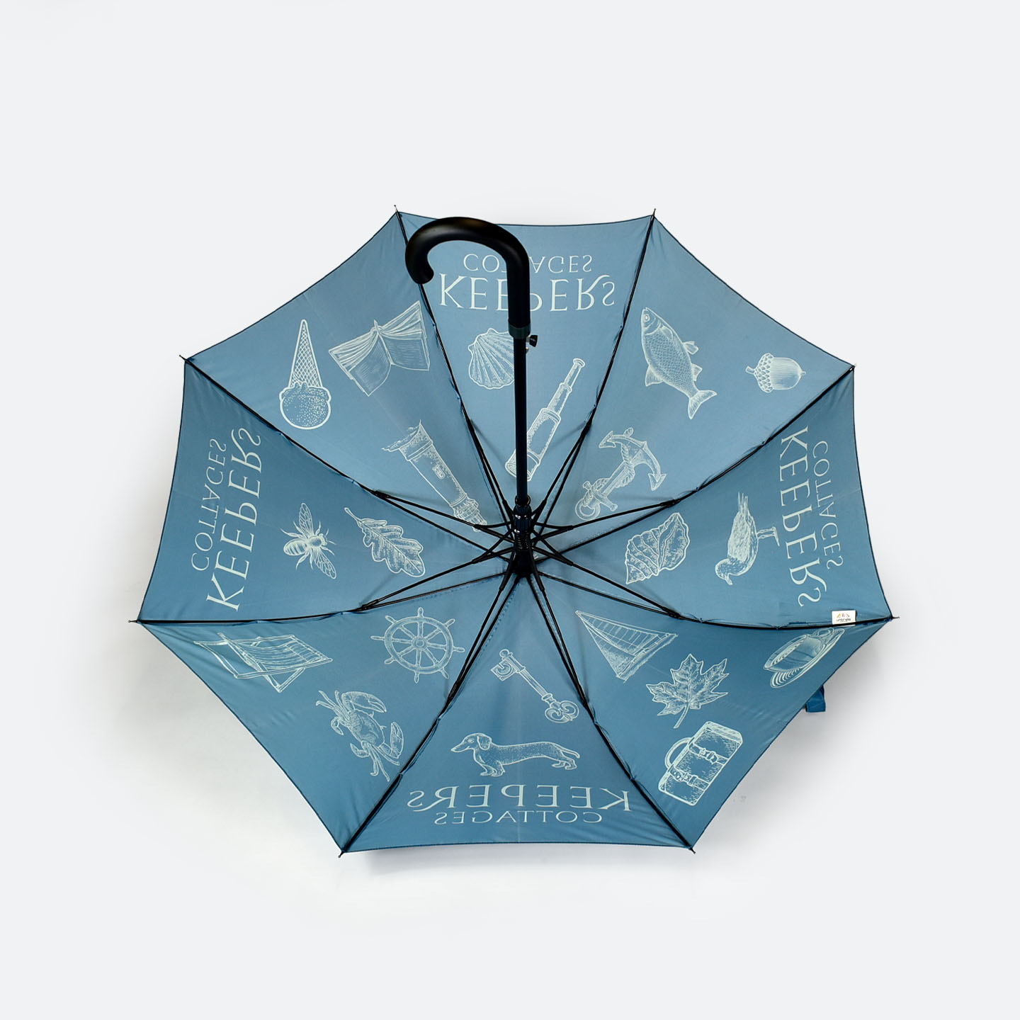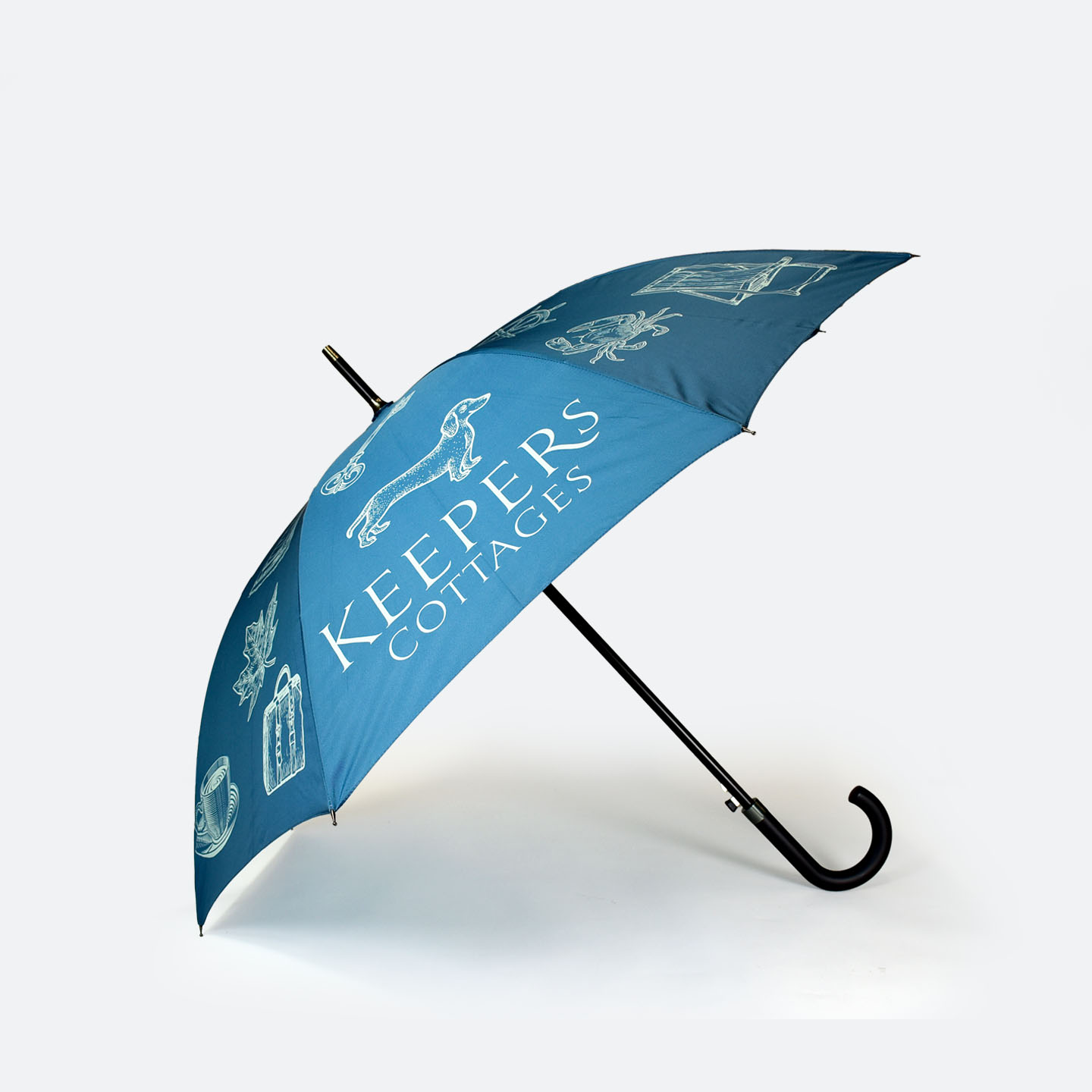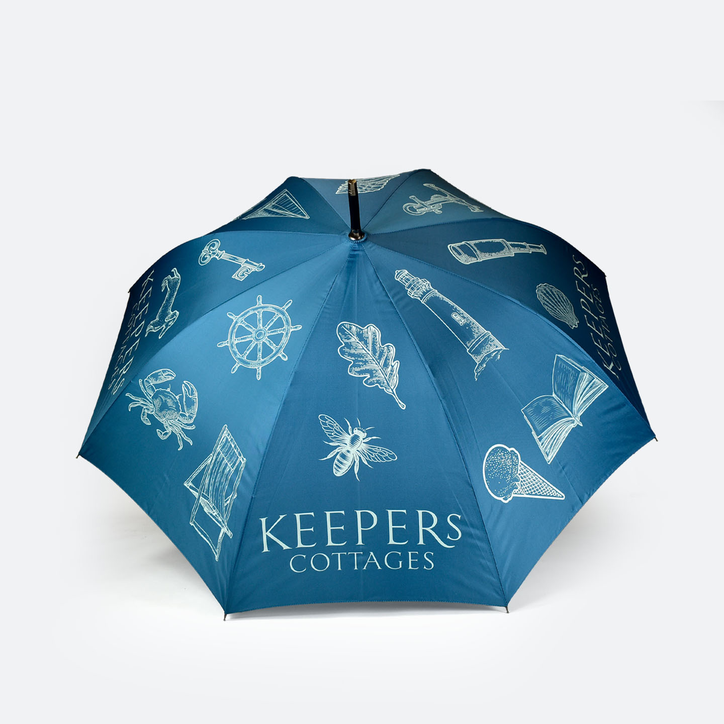 The Umbrella Workshop (a division of the Wurlin Group) stepped in to manufacture custom illustrated umbrellas that transformed a simple weather accessory into a piece of bespoke artist-edition merchandise. By utilising our City Walker frame and executing a complex, 8-panel Pantone-matched print, we successfully bridged the gap between a creative vision and a high-durability reality. Here we explore the journey from dainty white illustrations to a sophisticated, aqua-marine brand asset that now serves as a hallmark of the Keepers Cottages guest experience.
