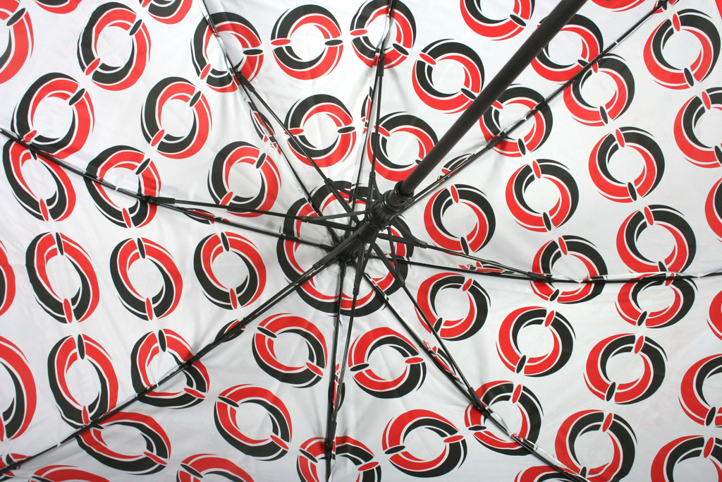Made to order umbrellas are customised in multiple ways. From printing inside and outside of the umbrella panels and matching the seams during construction for continuous prints, to the branded tie wrap which can be embroidered or printed. The umbrella carry sleeve can be personalised with print or with a strap. Other customisation options include photo prints on umbrellas. Photo prints on umbrellas are eye-catching and great for galleries and creatives. Screen printing on umbrellas is great option for bold graphics. Logo prints are often best suited with a screen print.