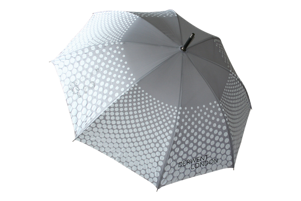 An eye catching screen printed dots umbrella in soft greys with subtle branding detail. Derwent London is a British-based property investment and development business. They chose our City Walker Umbrella that are popular among business professionals including financial services and property developers. We used an all over print on the topside of the umbrella, but we also offer the option of internal prints on the underside of the canopy, which can add a bit of fun to a plain umbrella.